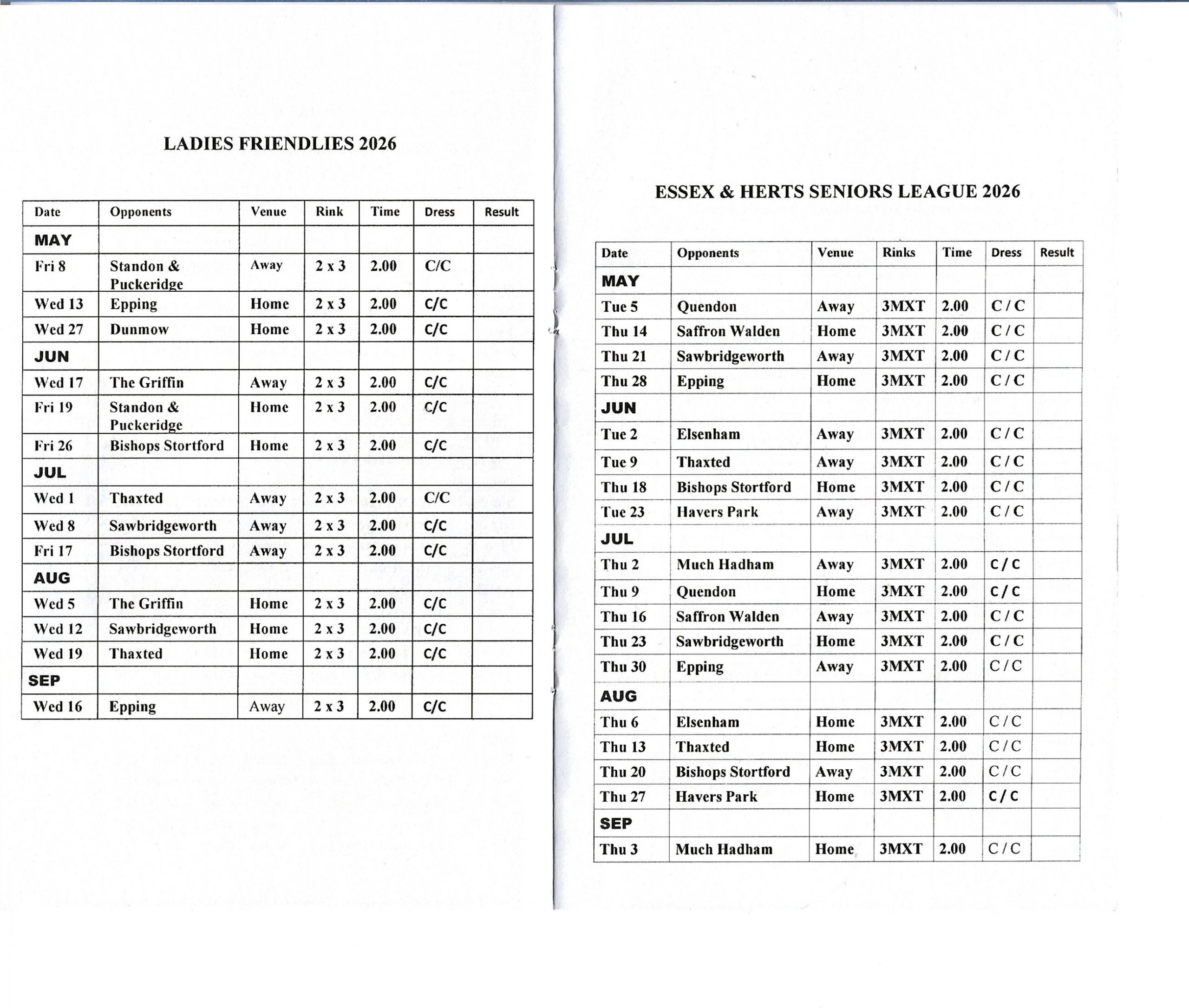 Ladies Friendlies and Essex & Herts Seniors League.