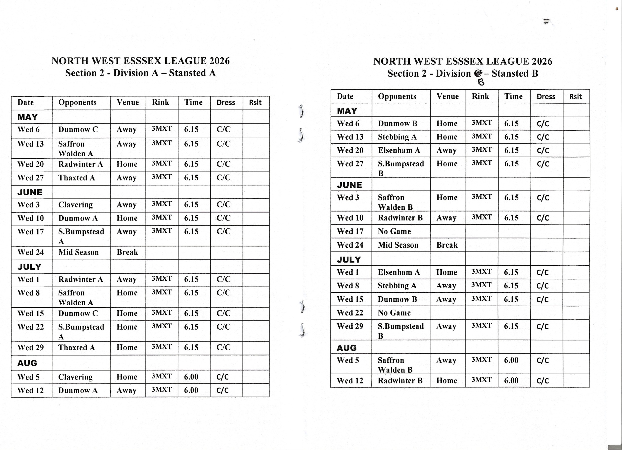 NWEL Fixtures for Both Teams.